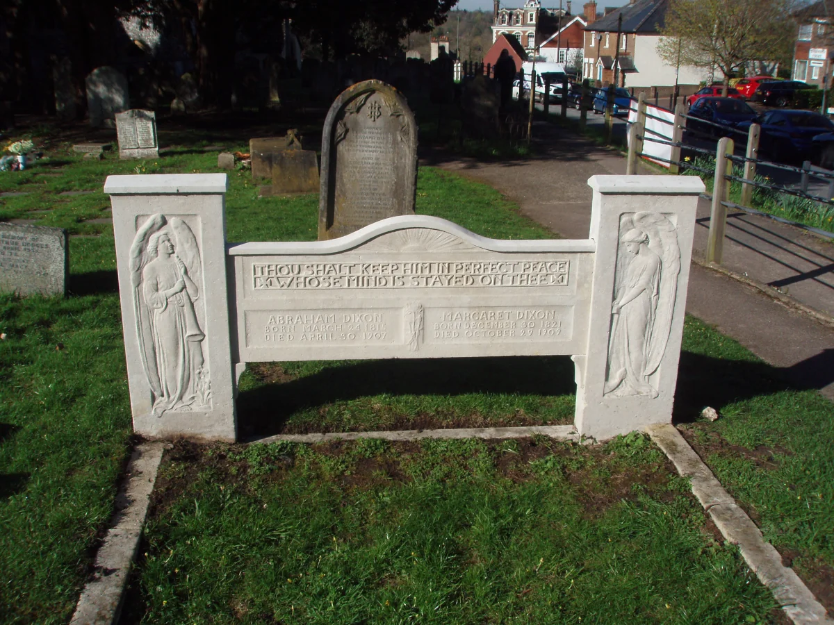 Abraham Dixon’s grave, where he is buried in a double plot alongside his wife, can be found in the graveyard of the Leatherhead Parish Church, St Mary and St Nicholas on Church Road. It was recently tidied up and restored by the trustees of the Leatherhead Institute as can be seen in the before and after views below.